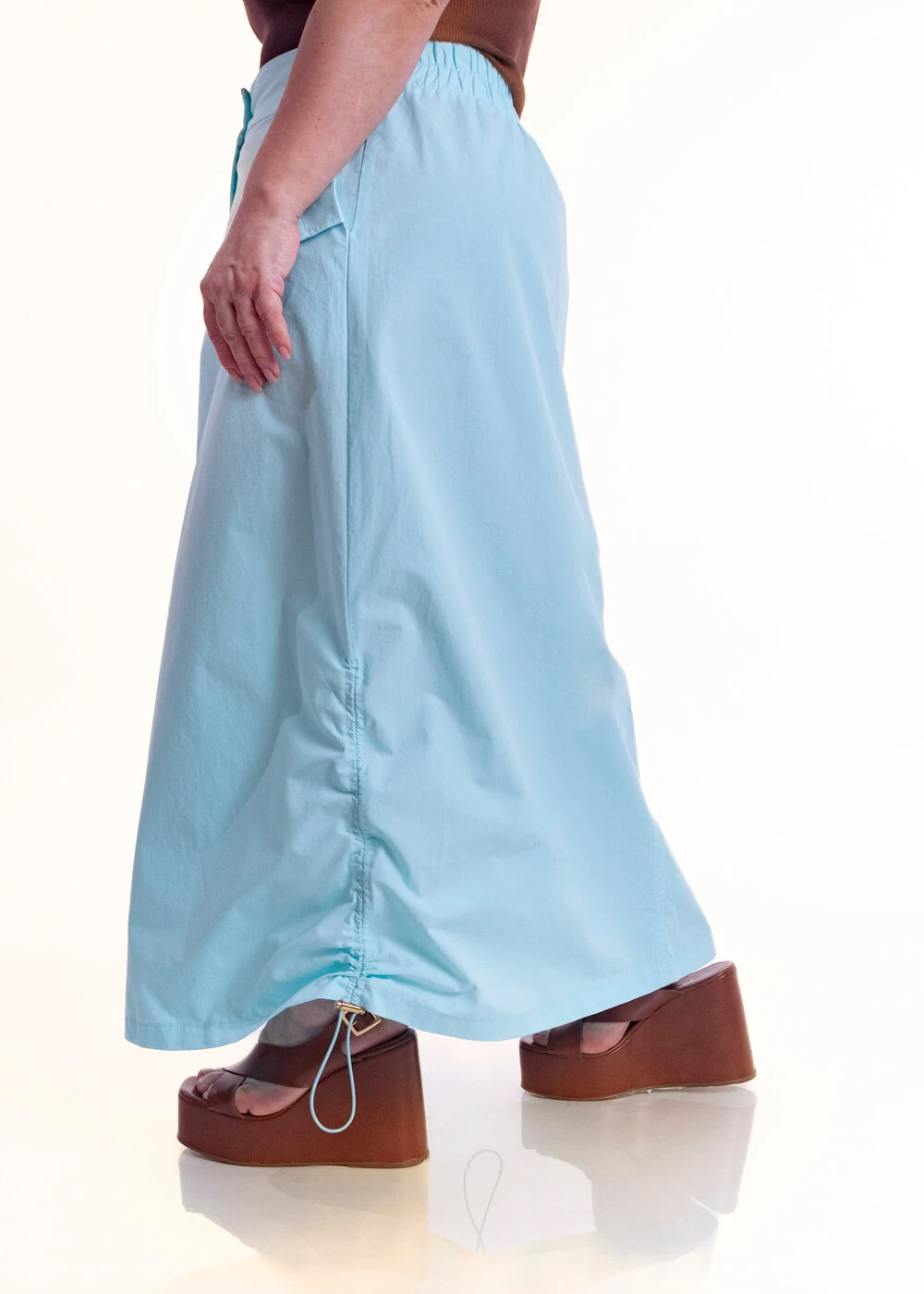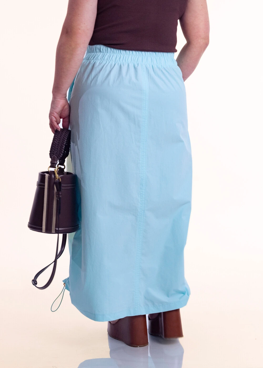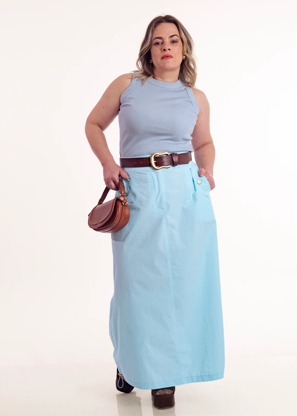 Saia Midi 100% algodão com lapela e elástico na barra para uma composição moderna e autêntica.
